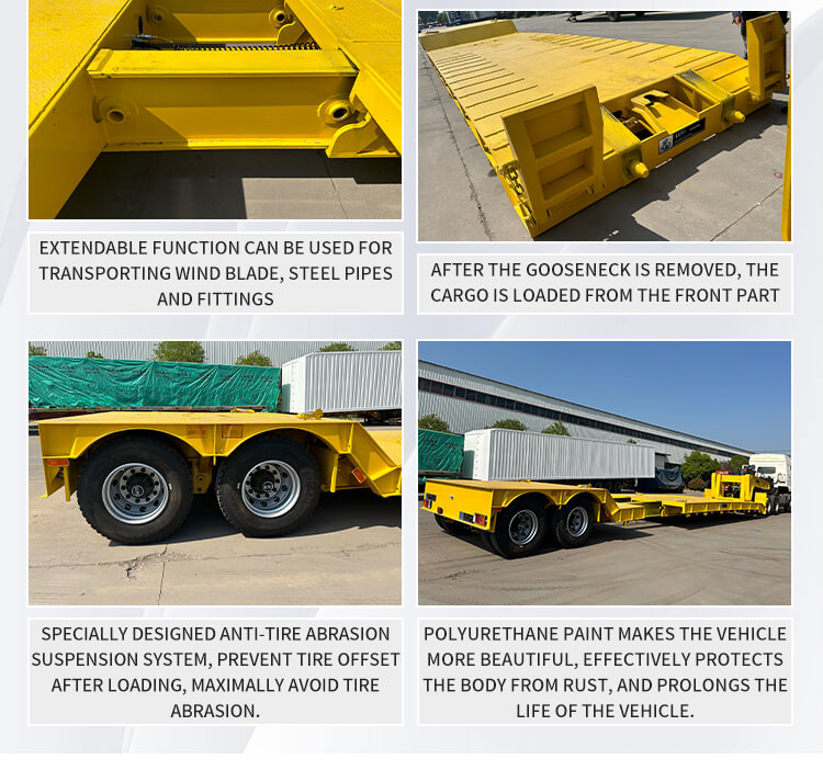 Equipped with 13-ton axles from brands like BPW, Fuwa, or CIMC, it offers optional mechanical spring or air suspension systems, paired with 12R22.5 tires for strong driving stability and a maximum effective payload of 120 tons. It is configured with 28-ton landing legs from JOST, Fuwa, or Yahua, and optional 90# or 50# kingpins, ensuring stable connection and high adaptability. With customizable colors, it becomes a reliable choice for heavy cargo transportation due to its detachable gooseneck design and robust load-bearing performance.