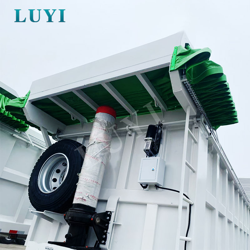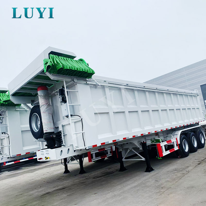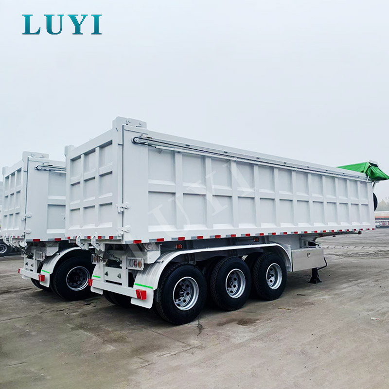 The LUYI brand white 3-axle rear-tilting dump semi-trailer, originating from high-quality manufacturing in Shandong, China, is an efficient truck trailer specially designed for heavy-load transportation. The product is made of high-strength steel, featuring a stable and durable structure. It has dimensions of 1300mm × 2500mm × 4000mm and a maximum load capacity of 100 tons, easily meeting the transportation needs of various heavy goods.