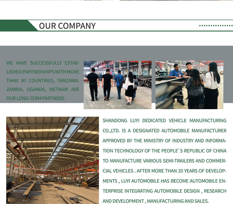 luyi semi trailer Manufacturing Co., LTD specializes in the production of all kinds of semi-trailers cement tank trucks oil tank trucks dump semi-trailers container semi-trailers flat panel semi-trailers skeleton semi-trailers barns semi-trailers low panel