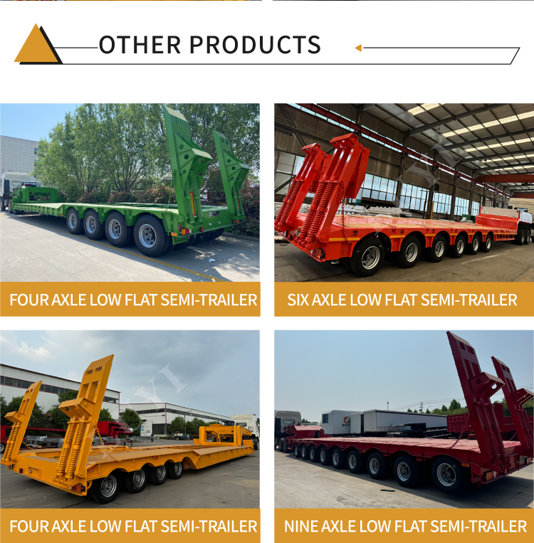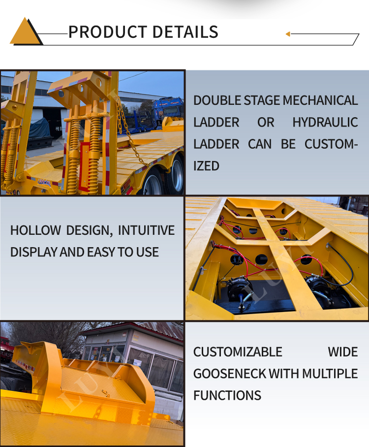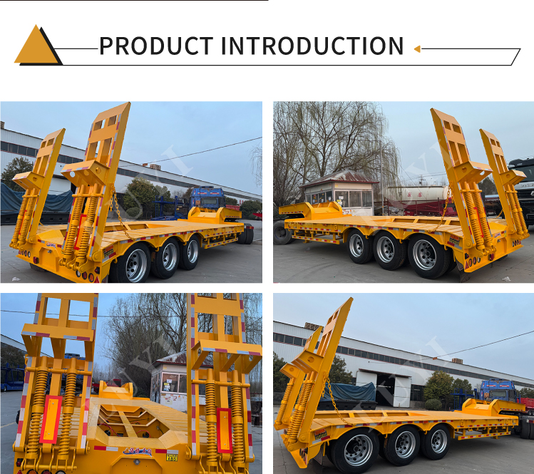 Equipped with 3 premium Fuwa or BPW axles, the trailer offers flexible suspension options (mechanical or air) for stable rides on diverse roads. It comes with 12R22.5/12.00R20/11R22.5 tire choices, a hydraulic ladder for convenient loading/unloading of heavy equipment, and standard 28-ton landing gear for secure parking. The 2-inch (50mm) or 3.5-inch (90mm) JOST king pin ensures firm connection with tractors, while customizable colors meet personalization demands. Durable, adaptable, it's ideal for efficient heavy cargo transport.