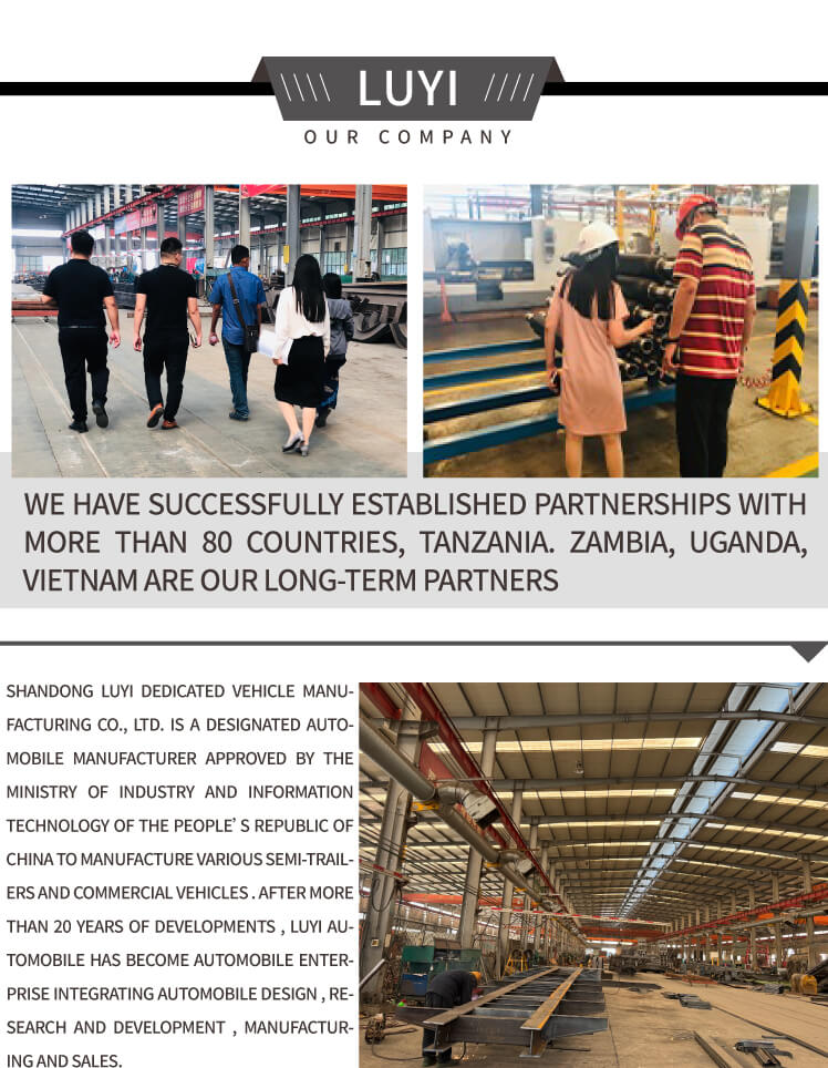 luyi semi trailer Manufacturing Co., LTD specializes in the production of all kinds of semi-trailers cement tank trucks oil tank trucks dump semi-trailers container semi-trailers flat panel semi-trailers skeleton semi-trailers barns semi-trailers low panel