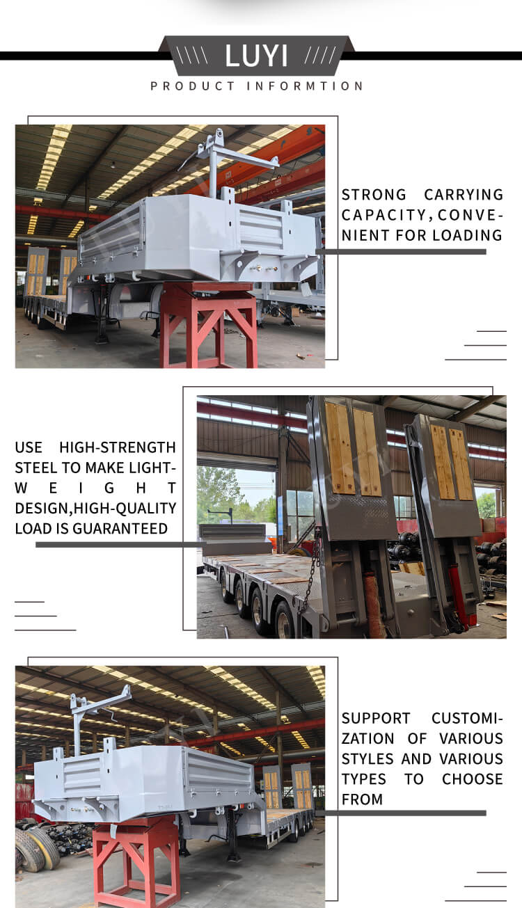 The trailer's dimensions are customizable, and it offers 2/3/4 axle options. Equipped with an air suspension system and 12R22.5 tires, it ensures smooth and comfortable driving. The standard 28-ton support legs provide reliable support, while the dual-line braking system guarantees driving safety. The rim specifications are 8.0/9.0×8/12/16 pieces, and the kingpin has 2-inch (50 mm) or 3.5-inch (90 mm) JOST options for strong adaptability. Customers can choose the color, balancing practicality and personalization, making it an ideal choice for efficient transportation.