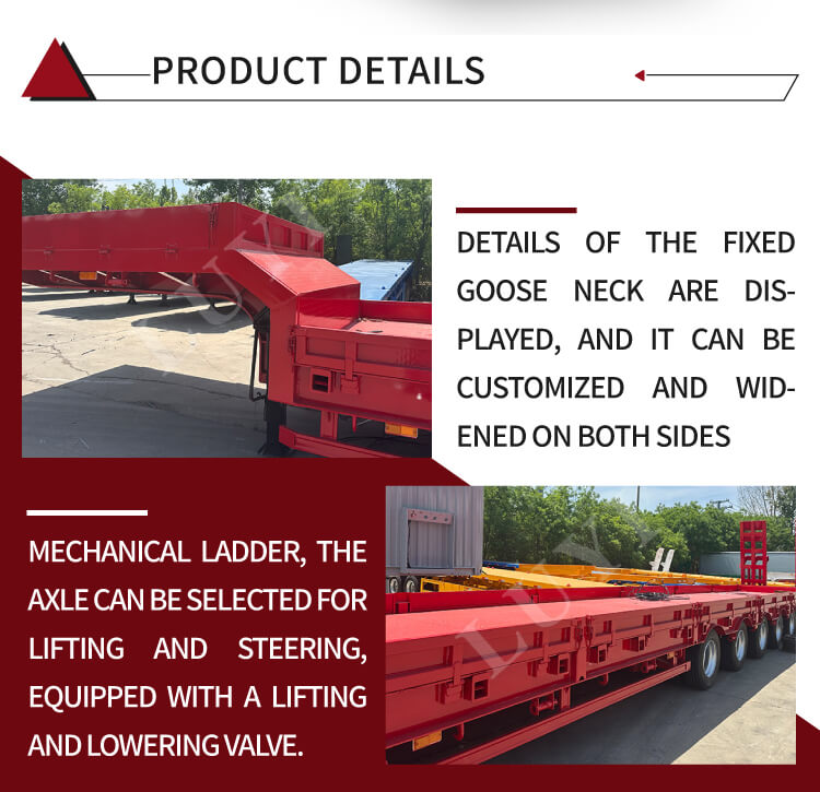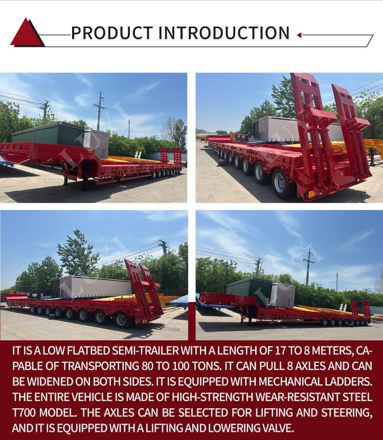 Constructed with high-quality carbon steel or aluminum, it balances durability and lightweight requirements, boasting a maximum payload of 100 tons to easily handle various heavy equipment transportation scenarios. Equipped with an 8-axle design, it offers optional Fuwa or BPW brand axles, paired with either mechanical suspension or air suspension systems, ensuring driving stability and cargo safety. Three tire specifications are available: 12R22.5, 12.00R20, and 11R22.5, suitable for different road conditions.