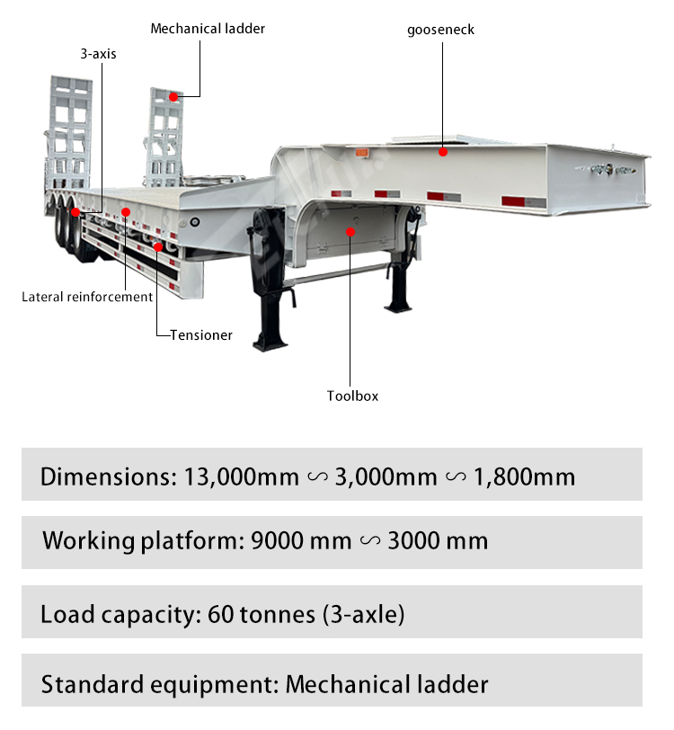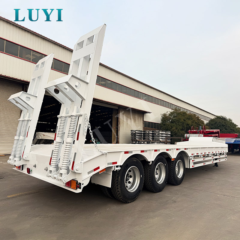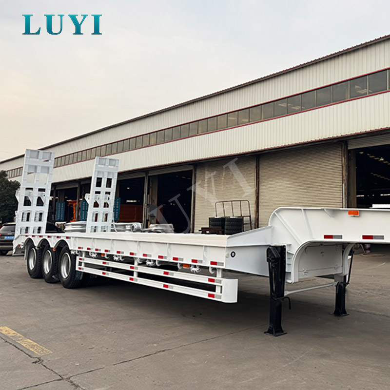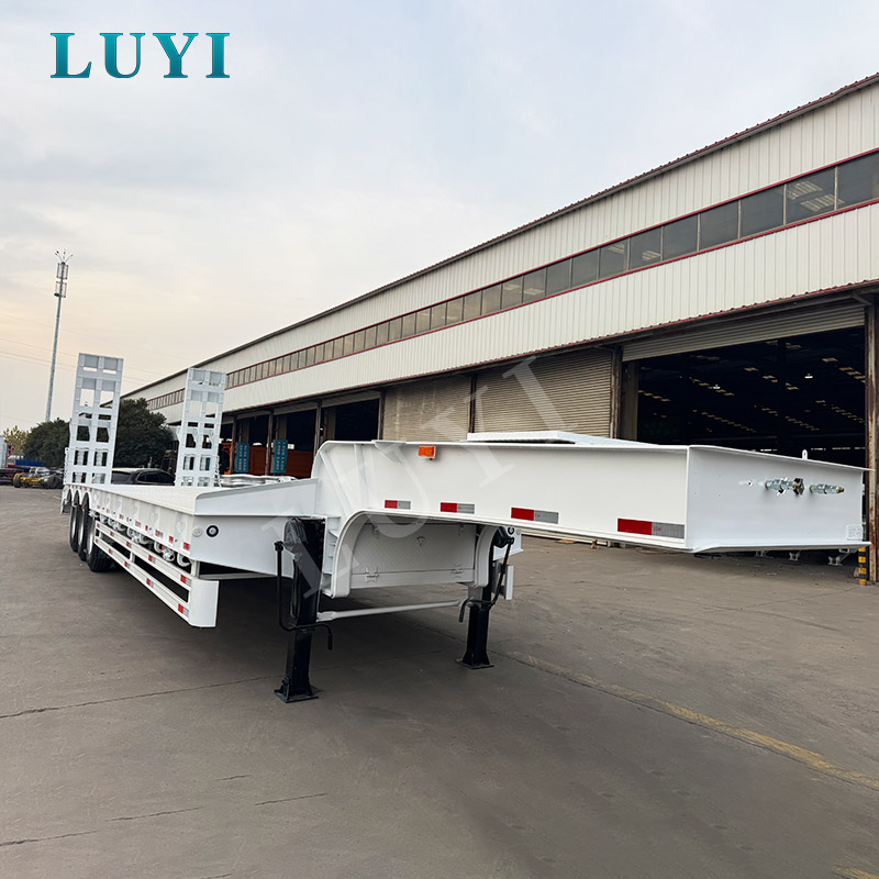 The LUYI 3-axle 60-ton lowbed semi-trailer, originating from Shandong, China, is a reliable choice for heavy-duty equipment transportation! Constructed with high-strength carbon steel, the trailer is robust, durable, and boasts excellent load-bearing capacity, with a maximum payload of 60 tons. It is perfectly suited for long-distance transportation of large cargo such as engineering machinery and heavy equipment.