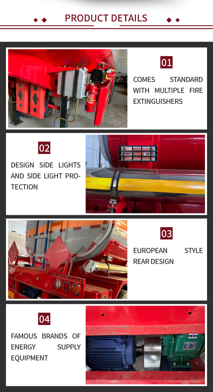Offering extensive customization, it supports structural adjustments (multi-compartment design, adjustable oil inlets/outlets), material upgrades (Q235 carbon steel, stainless steel for corrosion resistance, aluminum alloy for lightweight), and functional additions (wave baffles, temperature control, intelligent level gauges). As a semi-trailer, it pairs with tractors for high flexibility (separate parking for maintenance) and strict compliance with national regulations, including pressure tests and leak prevention, ensuring safe and efficient oil transportation.