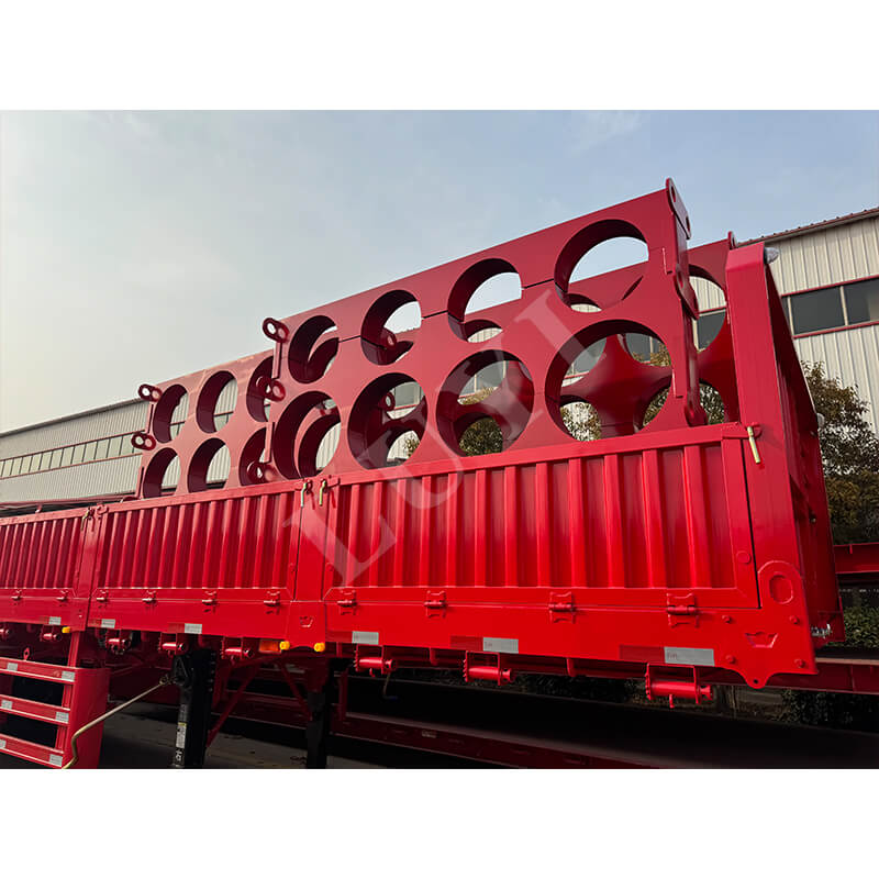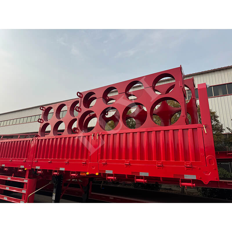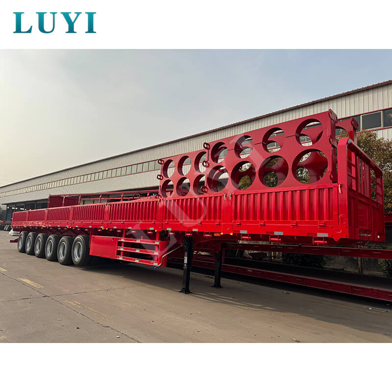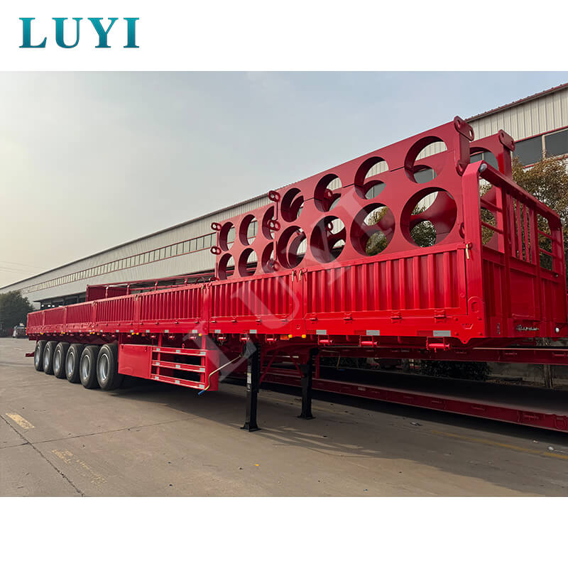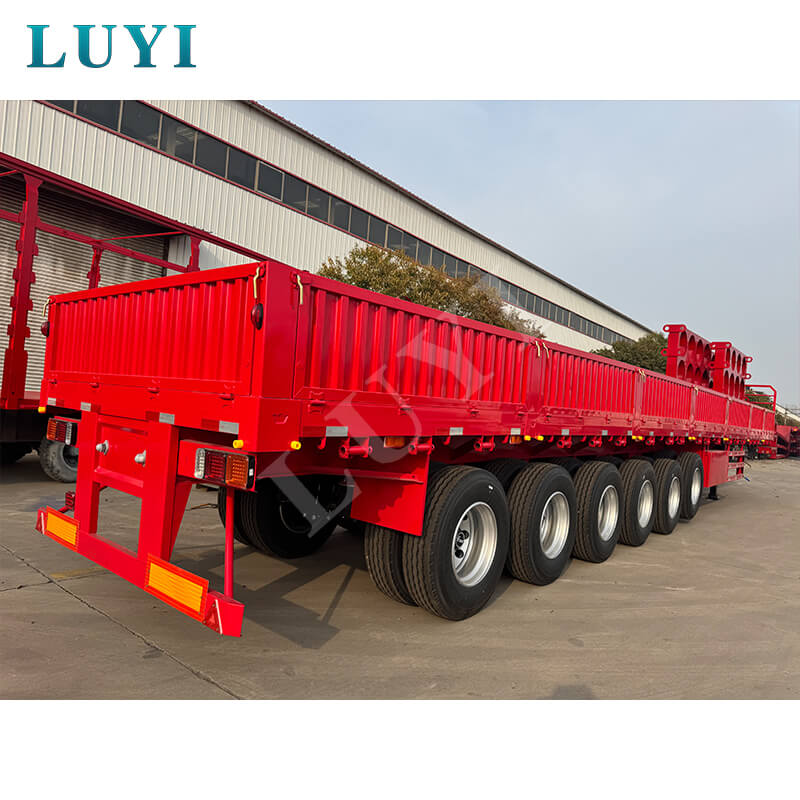 LUYI 6-Axle 15.5m 80-100 Ton 40ft Side Wall Semi-Trailer, also called a stake-type/flatbed semi-trailer, originates from Shandong, China. It is a high-quality semi-trailer designed for transporting containers and bulk cargo. Made entirely of steel, it measures 15500x2500x1600mm and has a maximum effective payload of 60-100 tons, boasting strong load-bearing capacity to easily meet heavy cargo transportation needs.